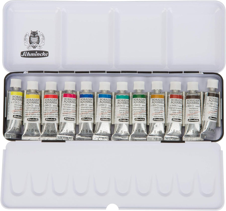 Schmincke – HORADAM AQUARELL Farbkasten, Grundsortiment, 12 x 5 ml Tuben, 74112097, Metallkasten, Ma