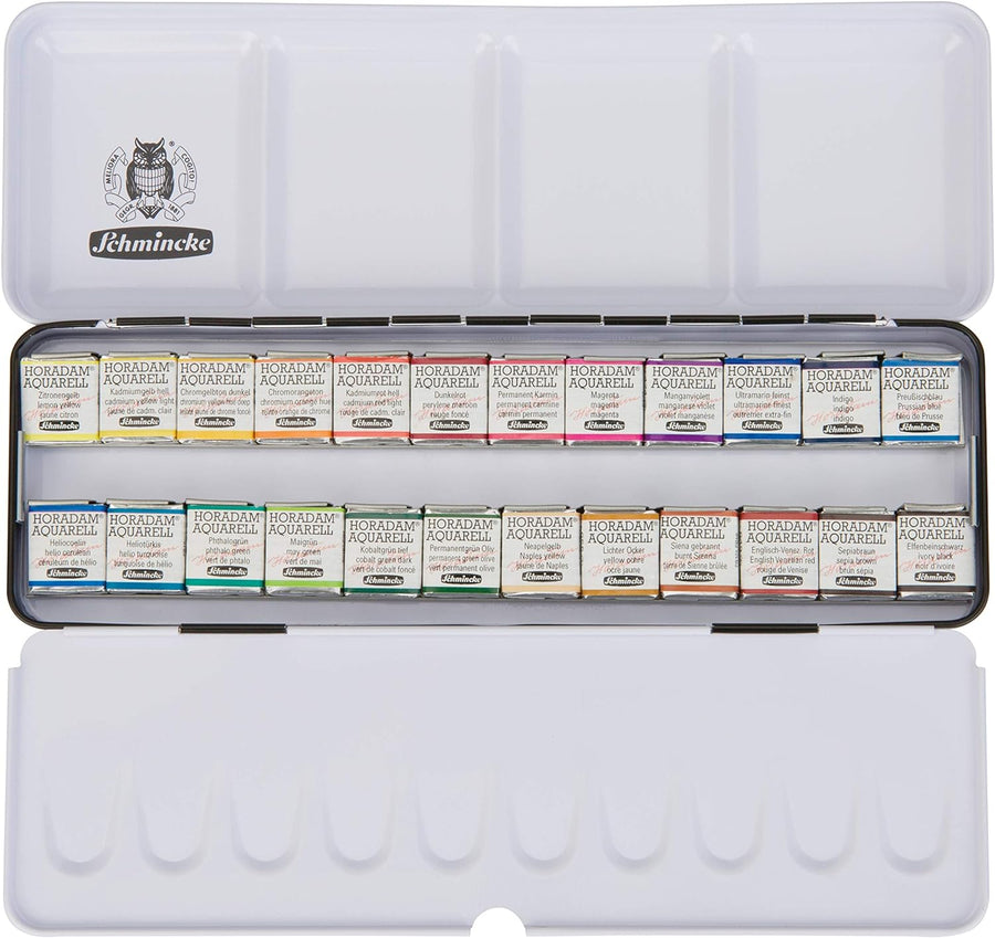 Schmincke – AKADEMIE Aquarell Farbkasten, Vollsortiment 24 x 1/2 Näpfchen, 75 424 097, Metallkasten,
