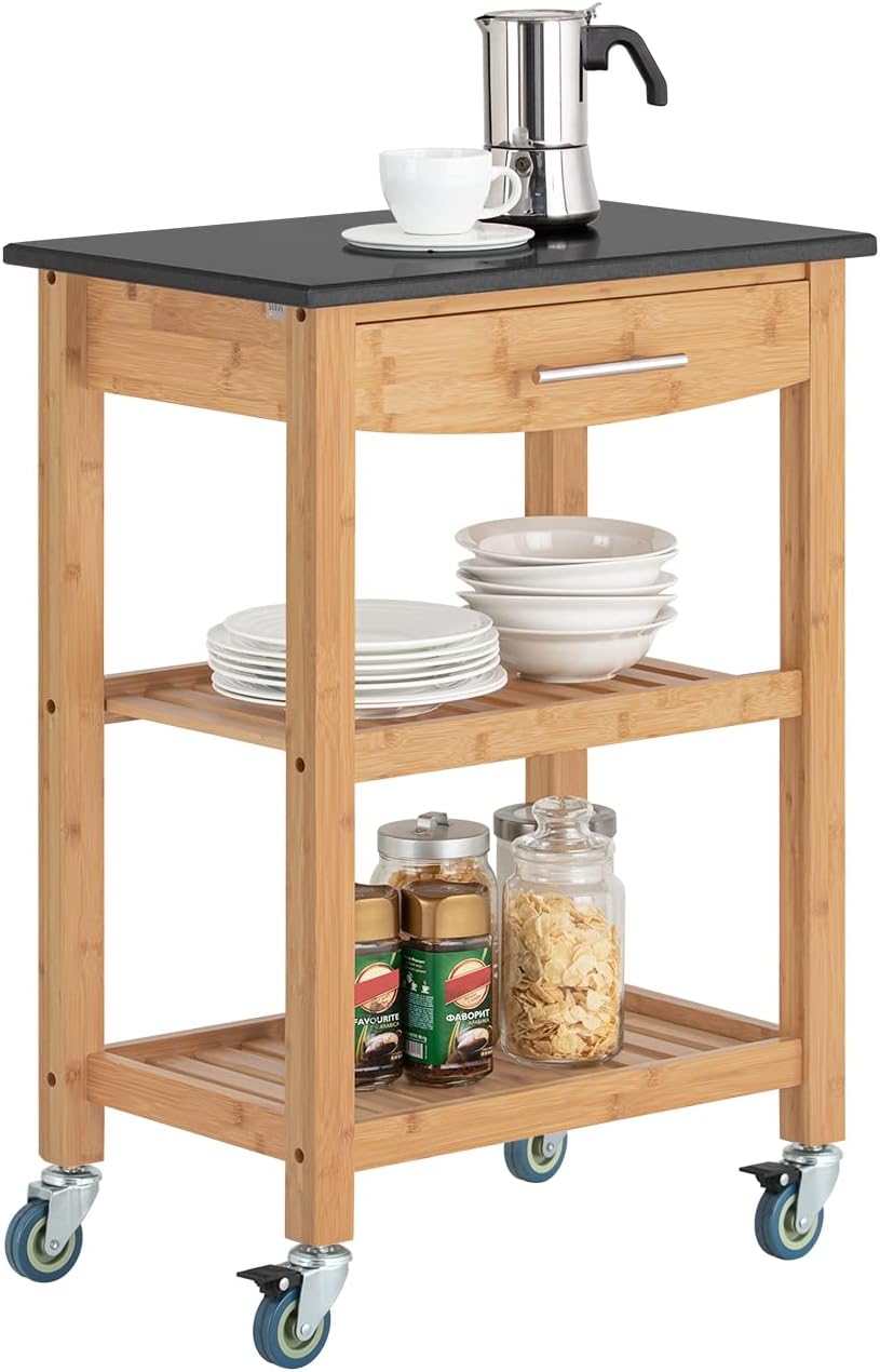 SoBuy FKW28-SCH Servierwagen mit Schublade und 2 Ablagen Kücheninsel Küchenwagen Küchenregal aus Bam