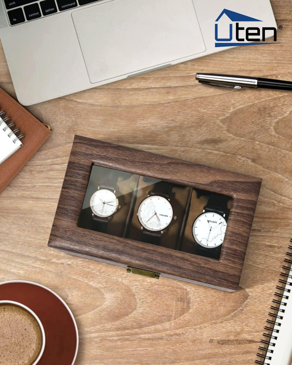 Uten Uhrenbox mit 3 Fächern, Uhrenbox mit Glasabdeckung, Uhrendisplay Aufbewahrungsbox für Damen und