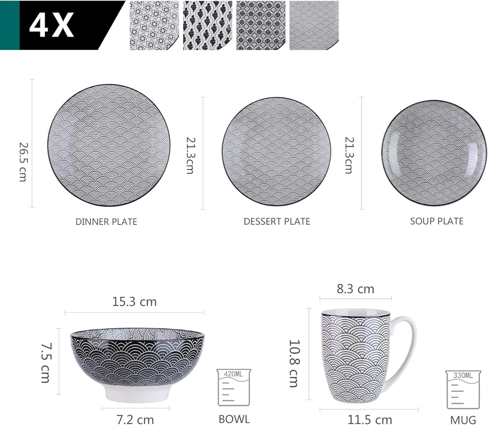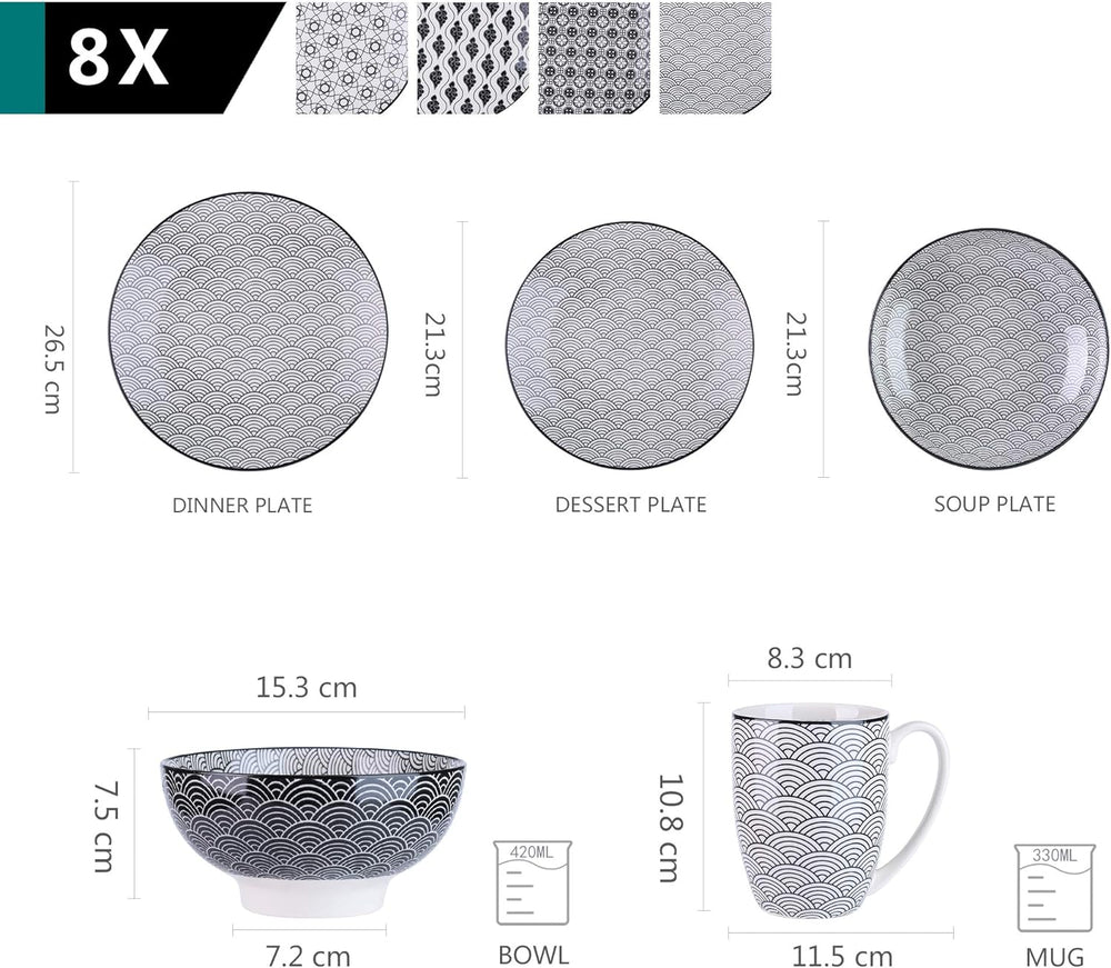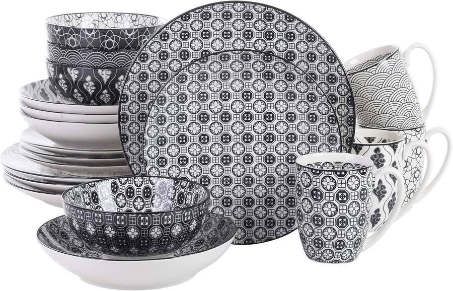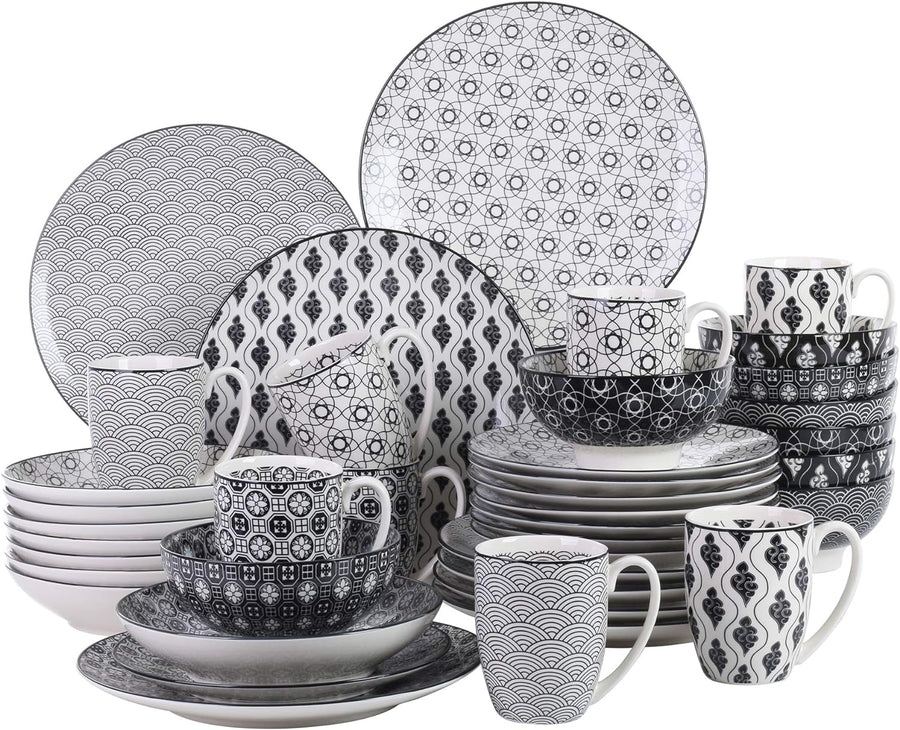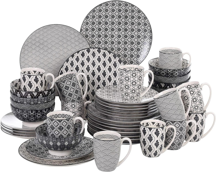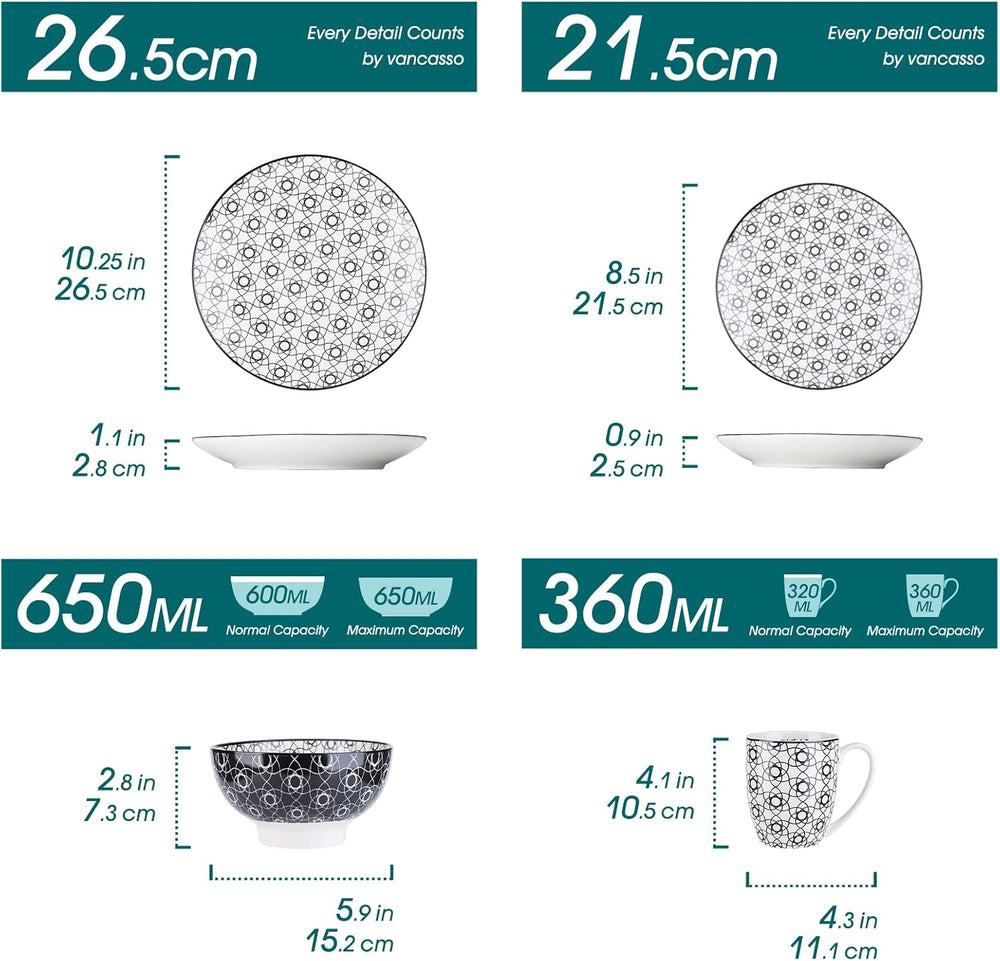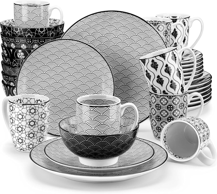 vancasso, Haruka Porzellan Geschirrservice, 32-teilig Rund Kombiservice für 8 Personen, Schwarz Schw
