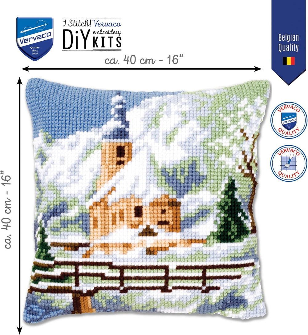 Vervaco Kirche im Schnee Kreuzstichkissen/Stickkissen vorgedruckt, Baumwolle, Mehrfarbig, 40 x 40 x