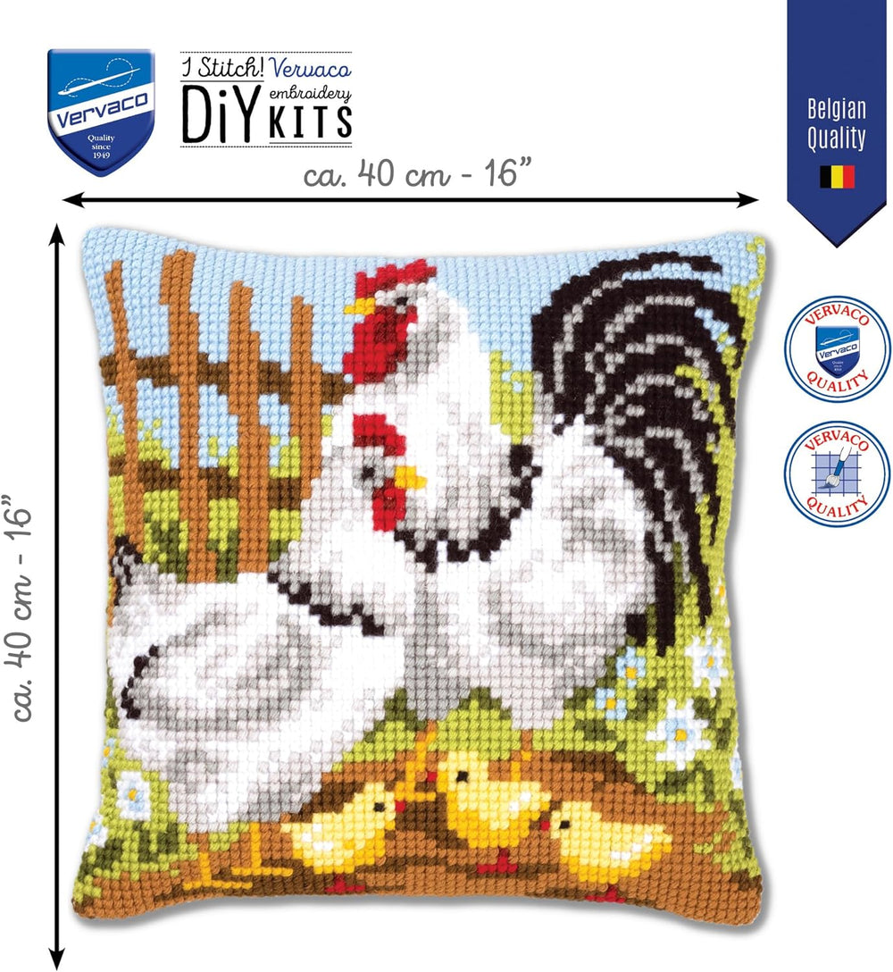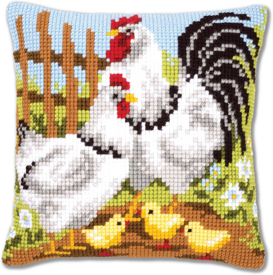 Vervaco Hühnerfamilie auf Bauernhorf Kreuzstichkissen/Stickkissen vorgedruckt, Baumwolle, Mehrfarbig
