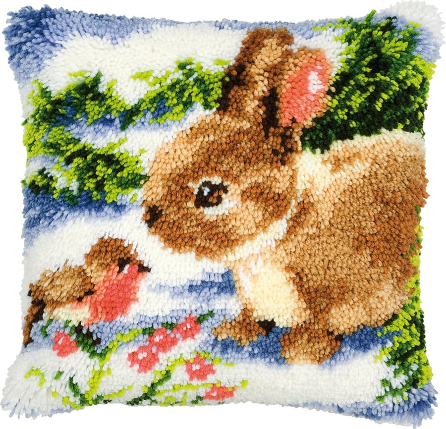 Vervaco Kaninchen im Schnee Knüpfkissen mit Knüpfhaken, Baumwolle, Mehrfarbig, 40 x 40 x 1 cm