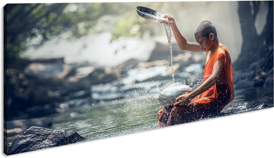 Buddhistischer Mönch Panorama 60x30 cm als Leinwandbild, Motiv fertig gerahmt auf Echtholzrahmen, Ho