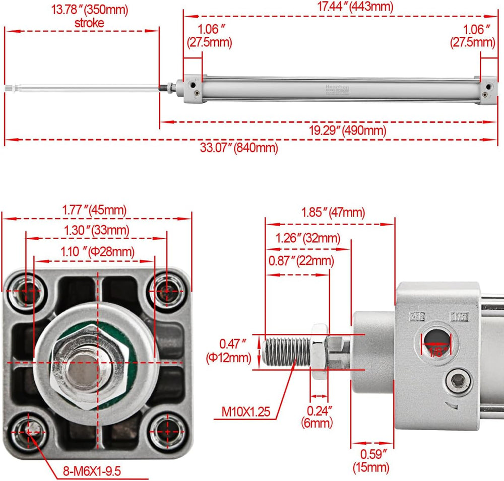 Heschen Pneumatischer Standard-Luftdruckzylinder, SC 32-350, PT1/8 Anschluss, 32mm Bohrung, 400mm Hu