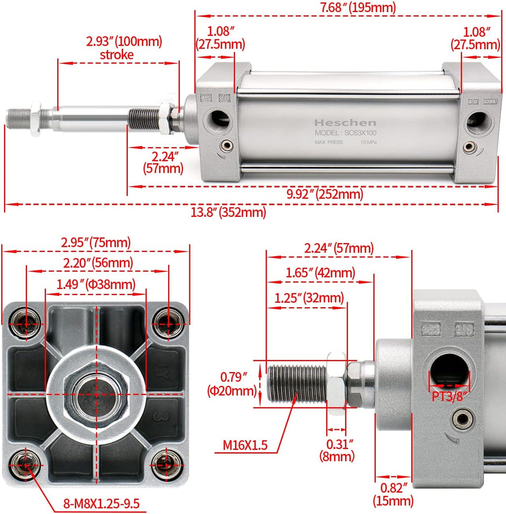Heschen Pneumatischer Standard-Luftdruckzylinder, SC 63-100, PT3/8'' Anschluss, 63mm Bohrung, 100mm