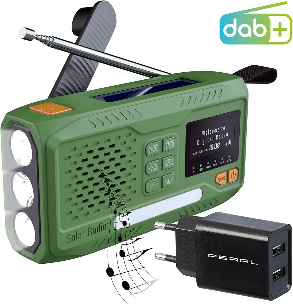 infactory Solar Radio: Mobiles DAB+-Kurbelradio mit EWF, Solarpanel, LED und USB-Netzteil (Dynamo Ku