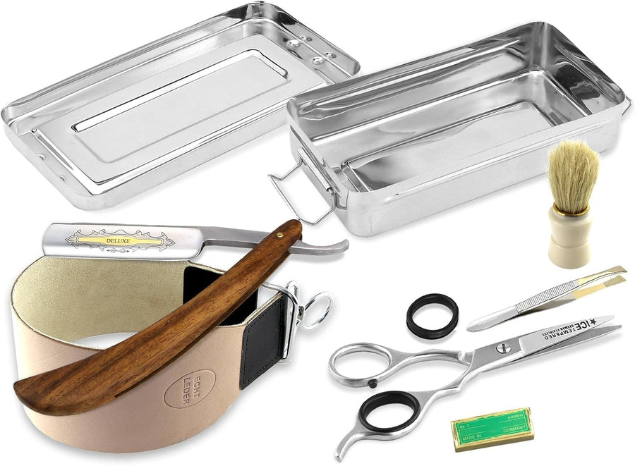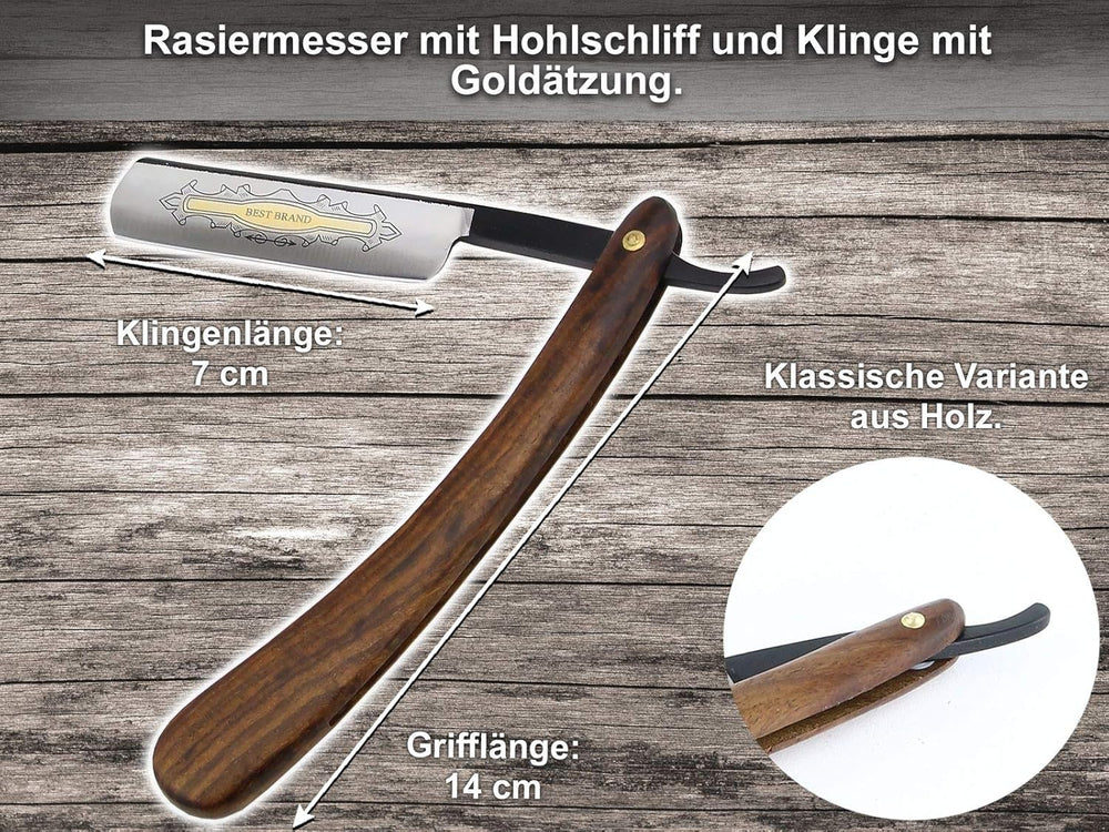 Rasiermesser Set mit Bartpflege Messer Schleifpaste aus Solingen und Extra breitem Abziehleder Strei