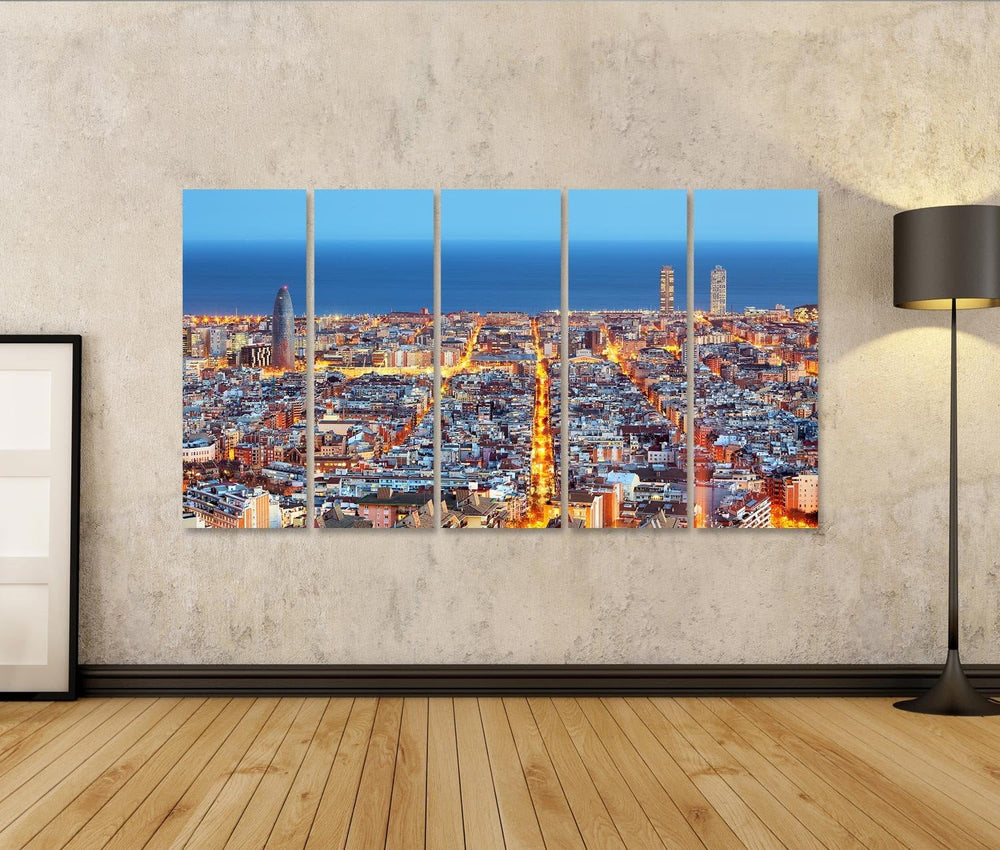 islandburner, Bild auf Leinwand Skyline von Barcelona, Luftaufnahme bei Nacht, Spanien Wandbild Post