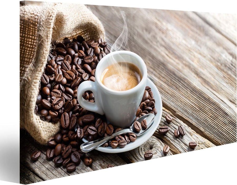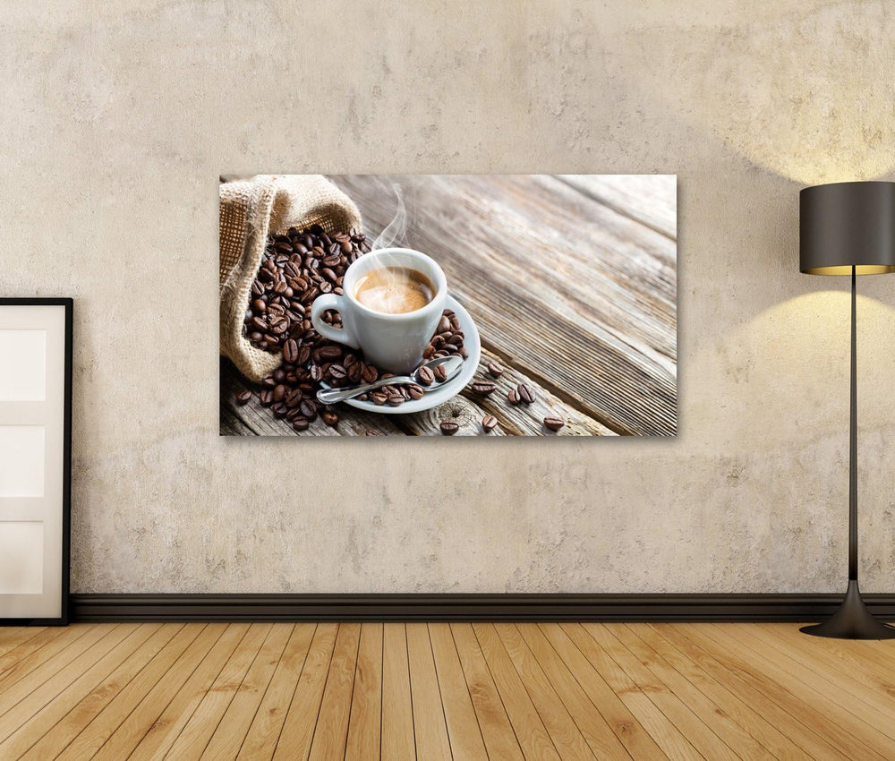 islandburner, Bild auf Leinwand Espresso-Kaffeetasse mit Bohnen auf Vintage-Tisch Wandbild Poster Le