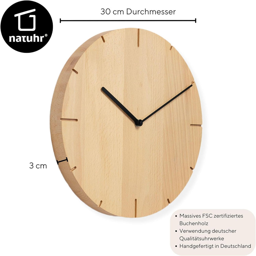 Natuhr Wanduhr Holz Buchwald geräuscharm Massivholz Buche (Buche geölt, Quarz Uhrwerk geräuscharm) B