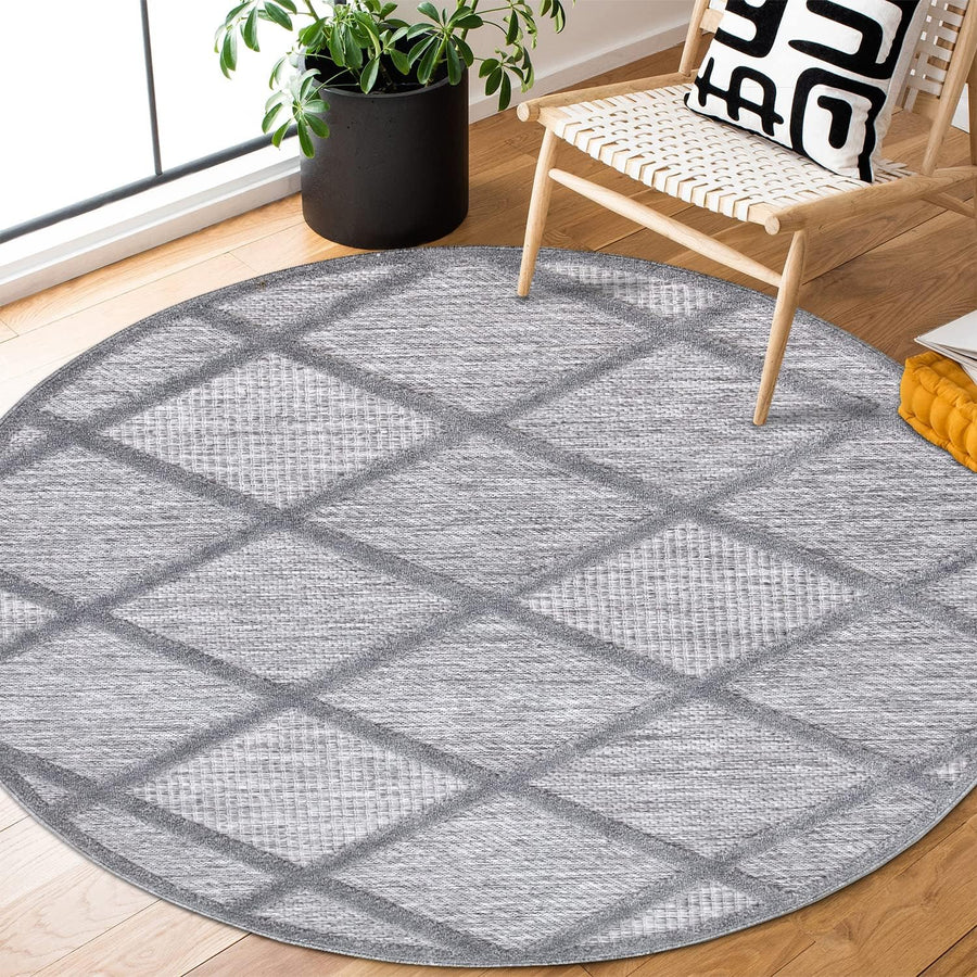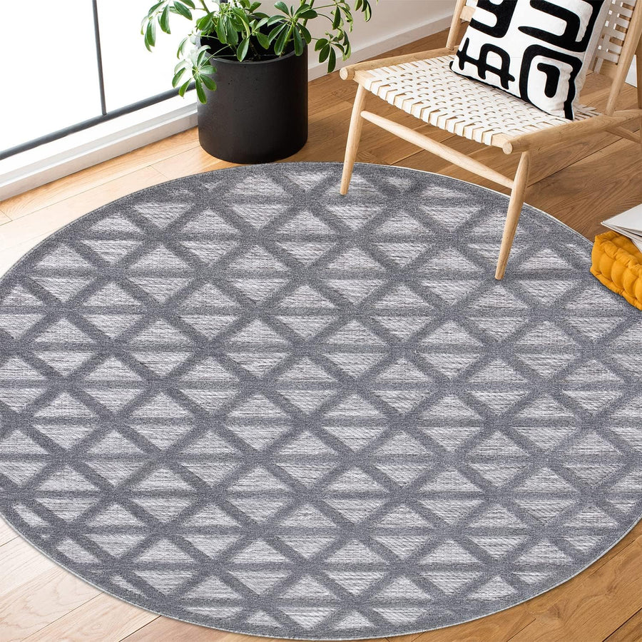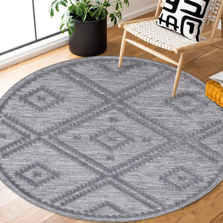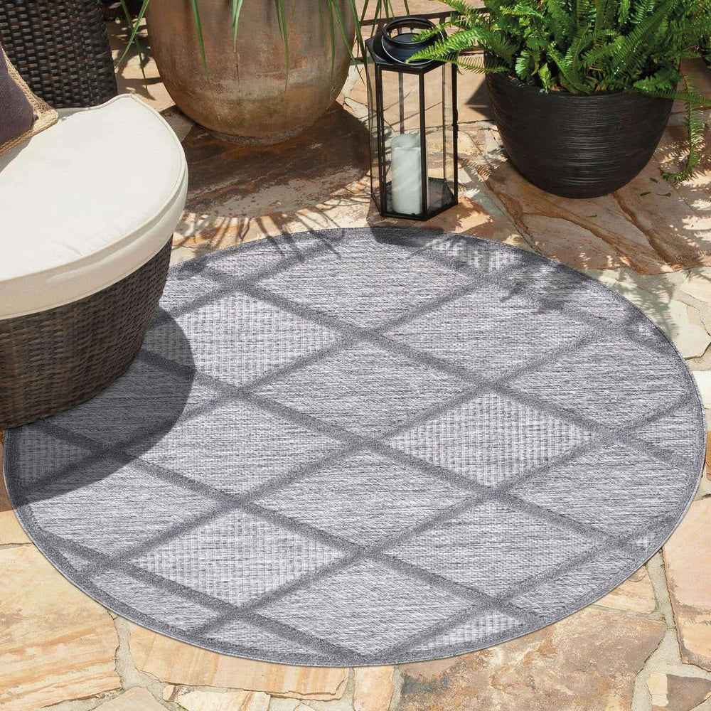 payé Teppich Outdoor Indoor - Rund 200cm - Anthrazit Raute - Boho Design Modern Vintage Teppiche Woh