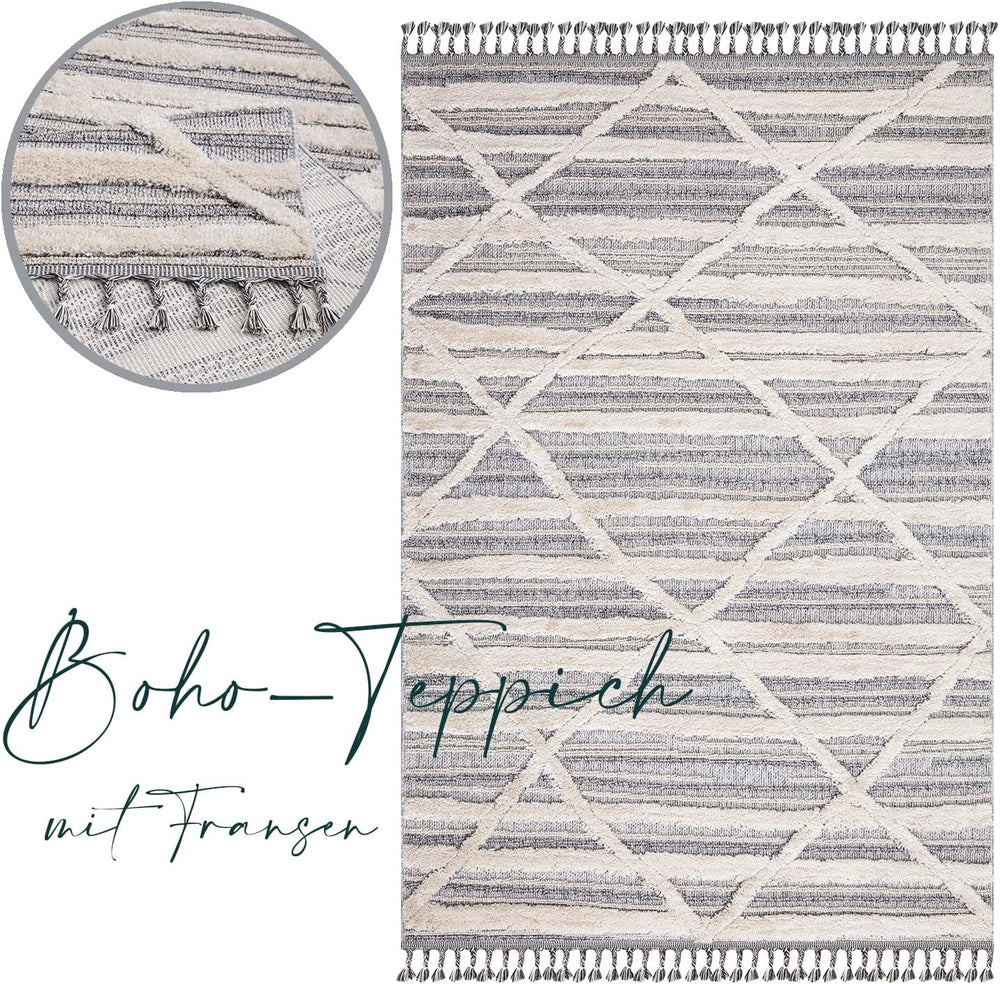 payé Teppich Wohnzimmer - 120x170cm - Creme Grau Blau - Raute Meliert - Hochtief Effekt - Fransen De