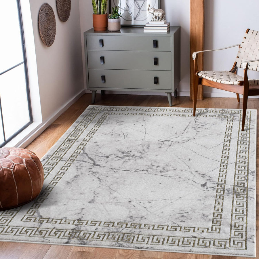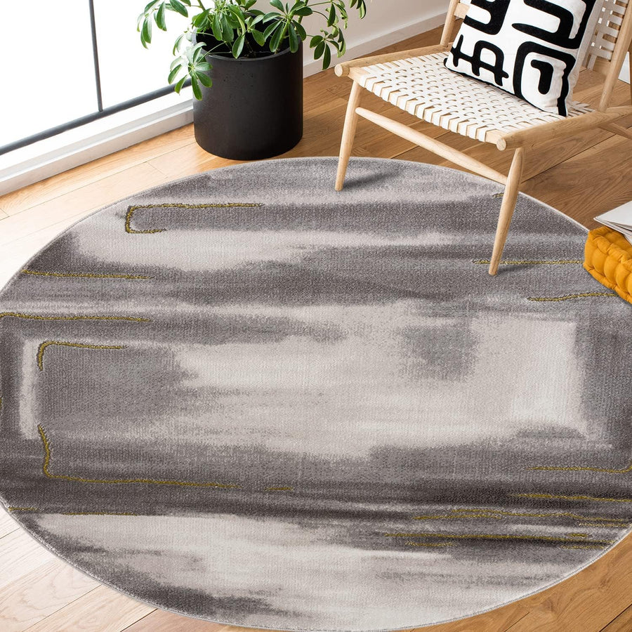 payé Teppich Rund - Grau Gold - 120x120cm - Bordüre Marmor Optik - Modern Vintage Muster Boho Style