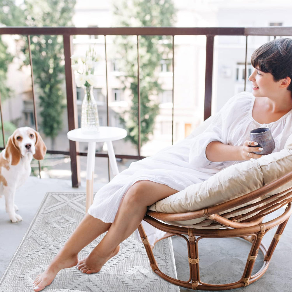 payé Teppich Läufer - Creme Ethno - 60x110cm - Boho Deko Teppiche für Balkon Terrasse Garten - Indoo