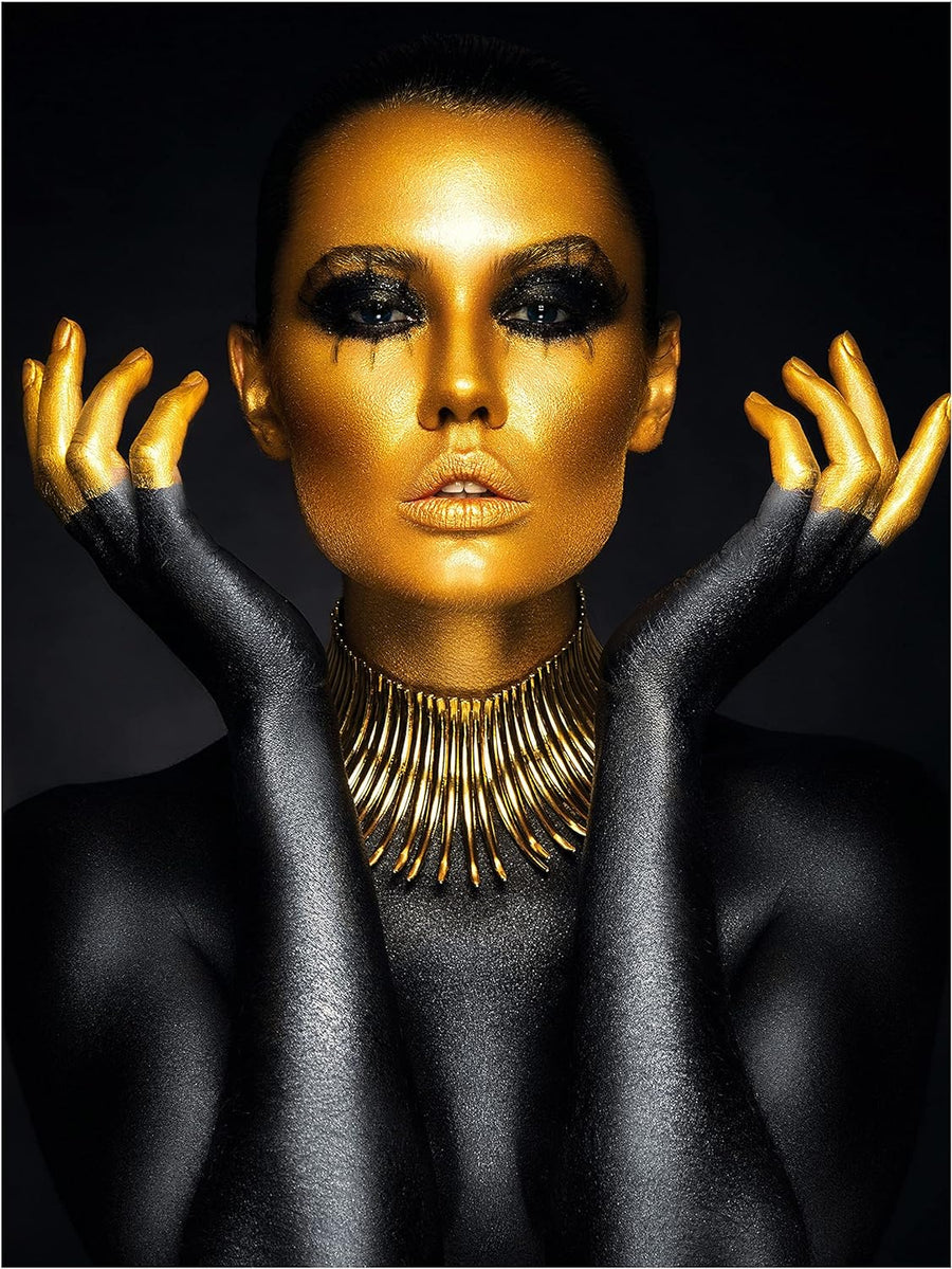 wandmotiv24 Leinwand-Bild Gold Collection, Grösse 100x75cm, Hochformat, Frau in Gold, schwarzer Hint