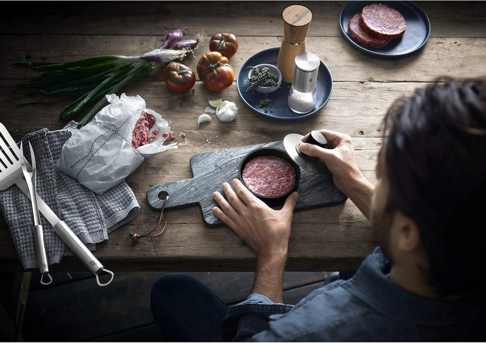 WMF BBQ Burgerpresse Edelstahl 12,5 cm, Pattypresse für gleichmässige Patties für leckere Hamburger,