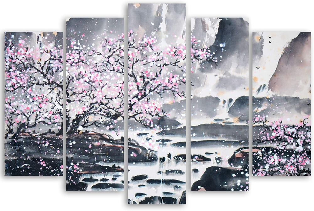 Feeby Frames, Leinwandbild Bilder Wand Bild - 5 Teile - Wandbilder Kunstdruck (KIRSCHBAUM, ROSA, GRA