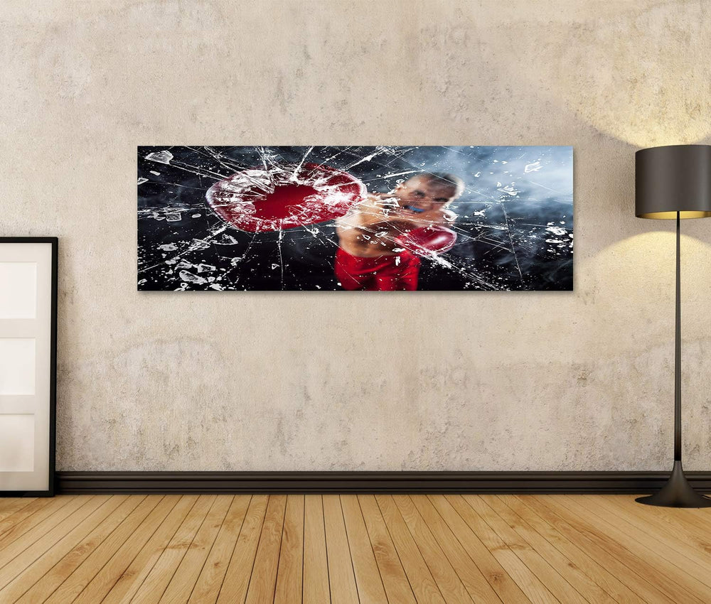 islandburner Bild auf Leinwand Boxer Zertrümmern Glas Junger Athlet Kickboxen Hintergrund Blauer Rau