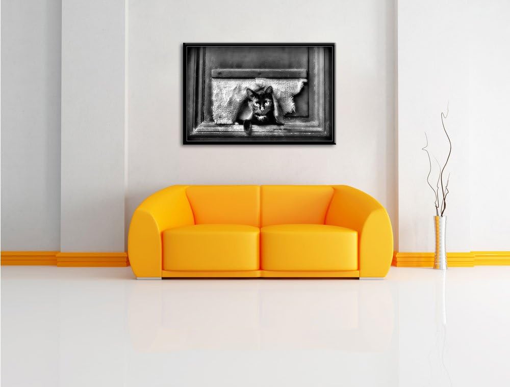 Pixxprint Monocrome, Schwarze Katze durch Hundeklappe, Format: 100x70 auf Leinwand, 100x70