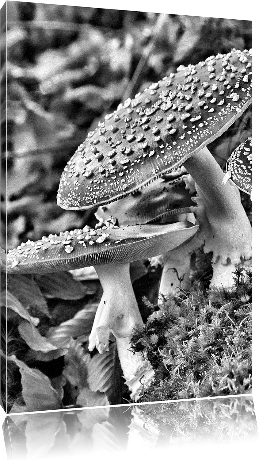 Pixxprint Monocrome, Vier Fliegenpilze auf Waldboden, Format: 100x70 auf Leinwand, XXL riesige Bilde