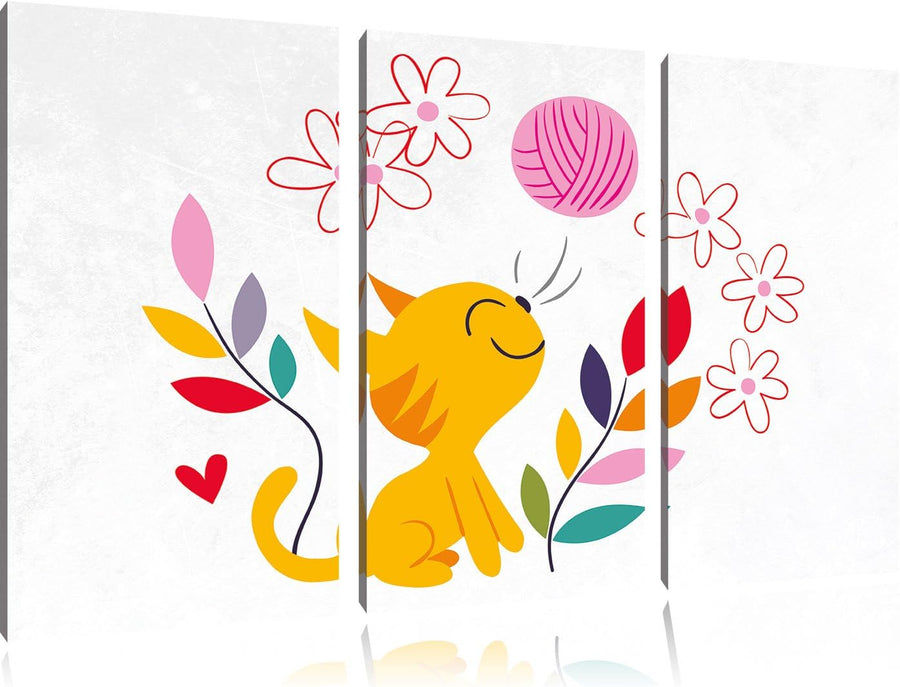 Pixxprint Niedliche Katze mit Wollknäuel als Leinwandbild/Grösse: 3 Teilig (120x80) cm/Wandbild/Kuns