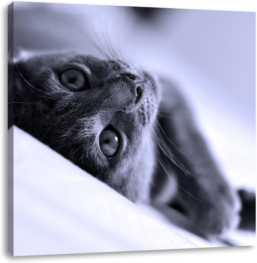 Pixxprint Niedliche Katze liegt im Bett/Format: 70x70cm / Leinwandbild fertig bespannt Wandbild Kuns