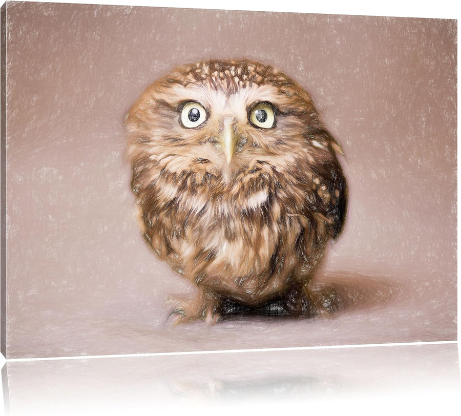 Pixxprint Niedliche Nachteule mit süssem Blick Kunst Buntstift Effekt, Format: 100x70 auf Leinwand,