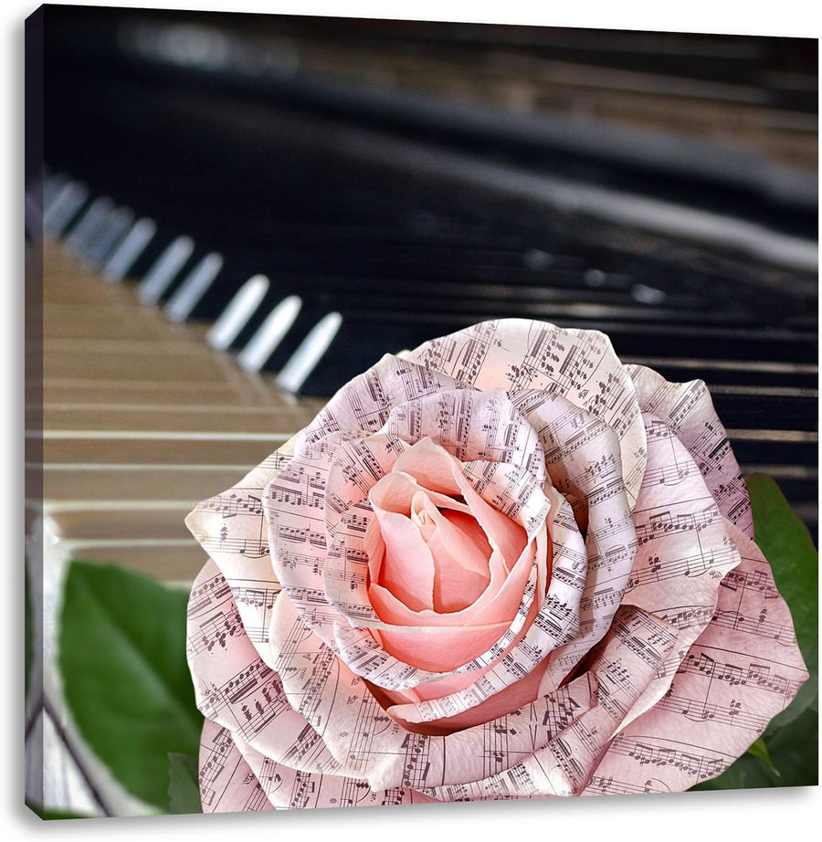 Pixxprint Noten auf zarter Rose neben Klavier, Format: 70x70 auf Leinwand, 70x70