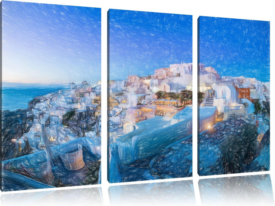 Pixxprint Oia Dorf am Sonnenuntergang Santorin Kunst Buntstift Effekt 3-Teiler Leinwandbild 120x80 B