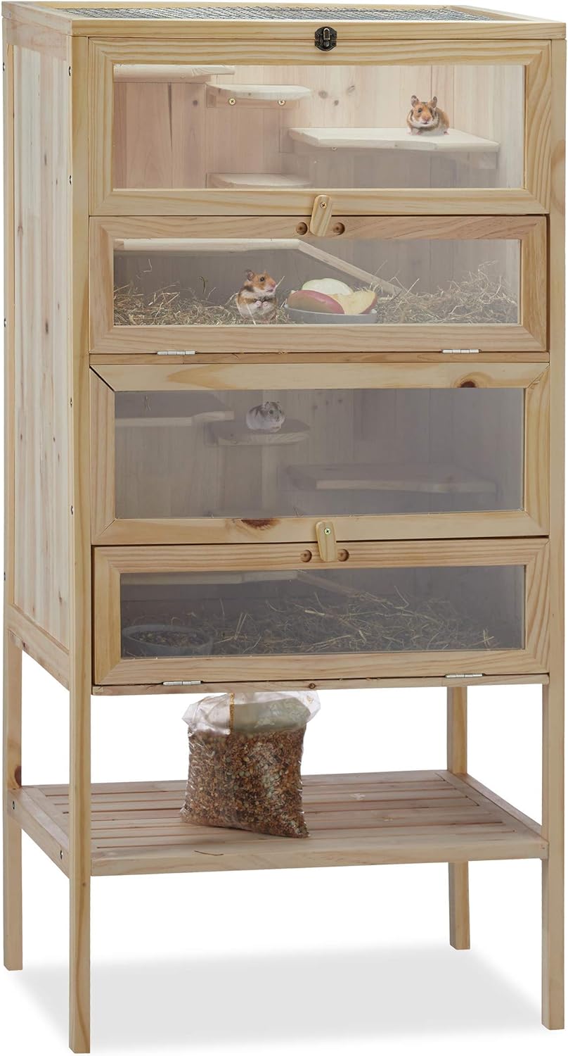 Relaxdays Hamsterkäfig aus Holz, 3 Etagen, Klappen, Sichtfenster, Gitterdach, Nagerkäfig XXL, HBT: 1