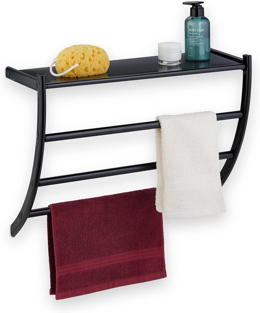 Relaxdays Handtuchhalter Wand, HBT: 44 x 56,5 x 23 cm, mit Ablage & 3 Handtuchstangen, Duschtuchhalt