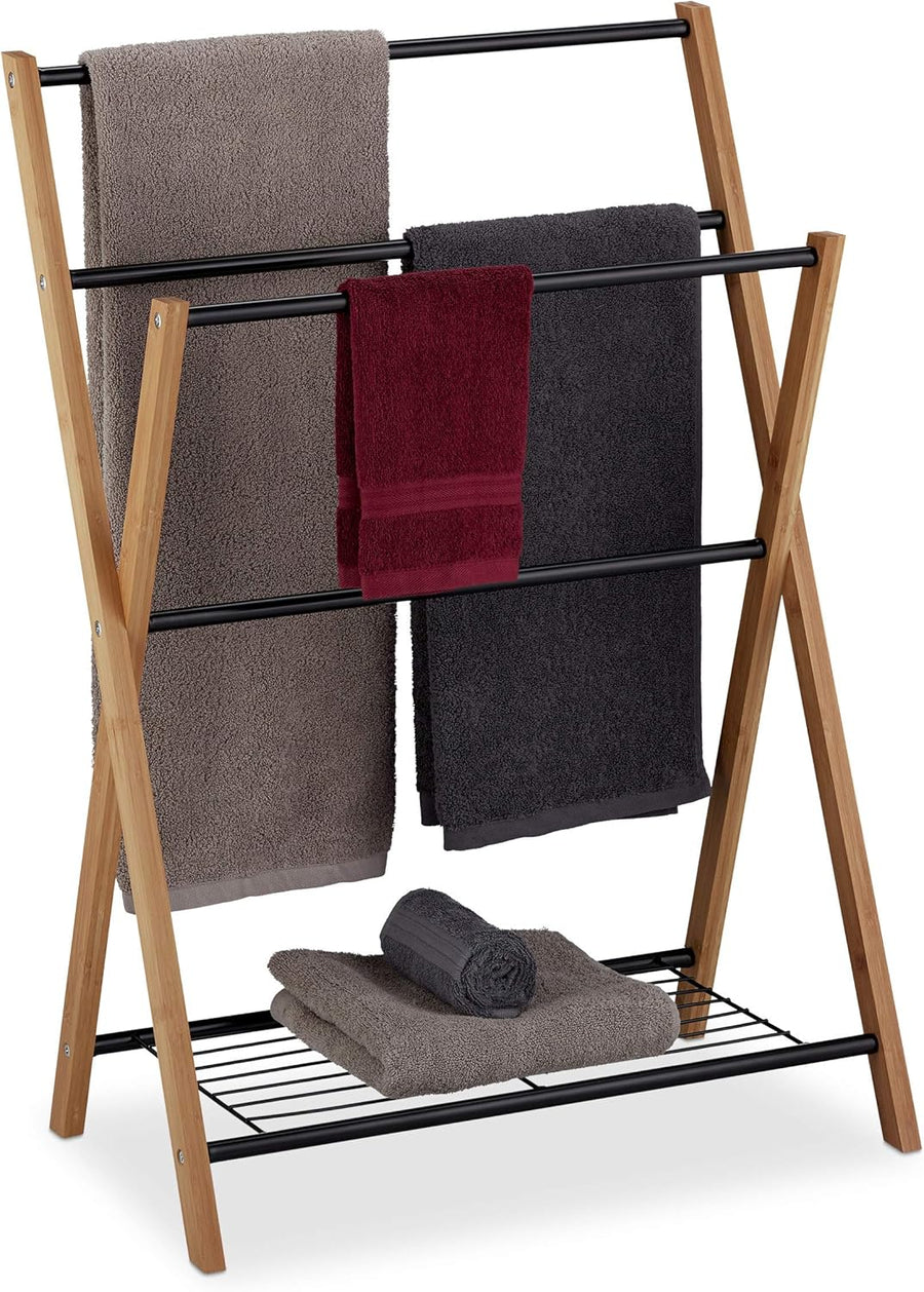 Relaxdays Handtuchhalter Bambus, Faltbar, kleiner Kleiderständer, 3 Ablagen, 3 Handtuchstangen, 4 se