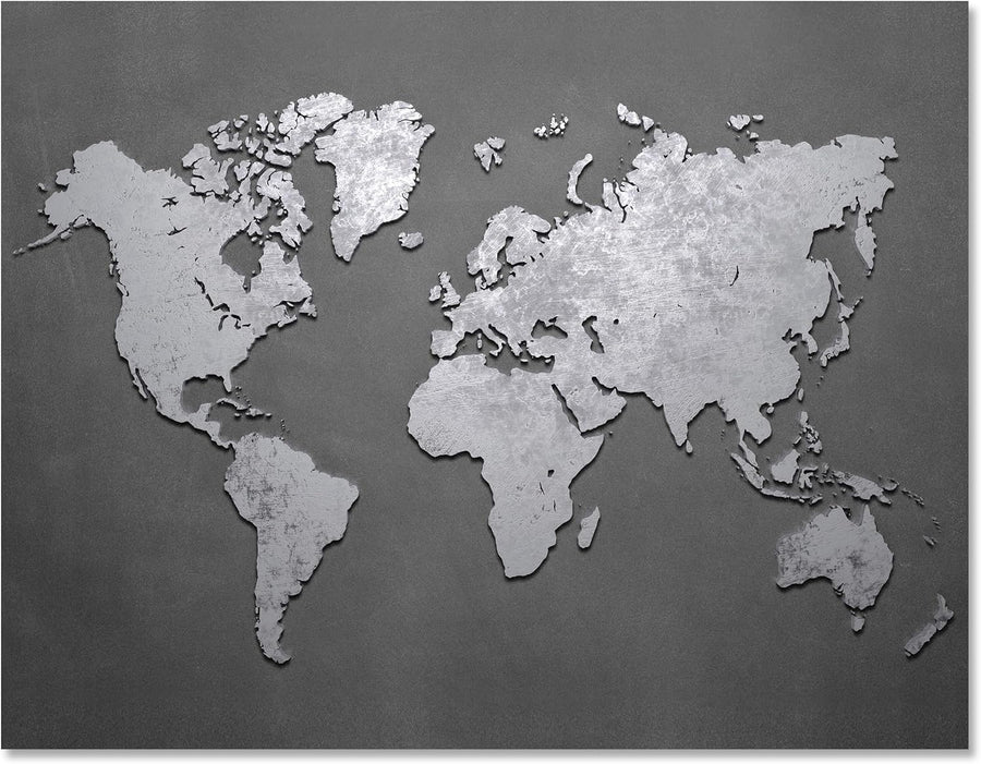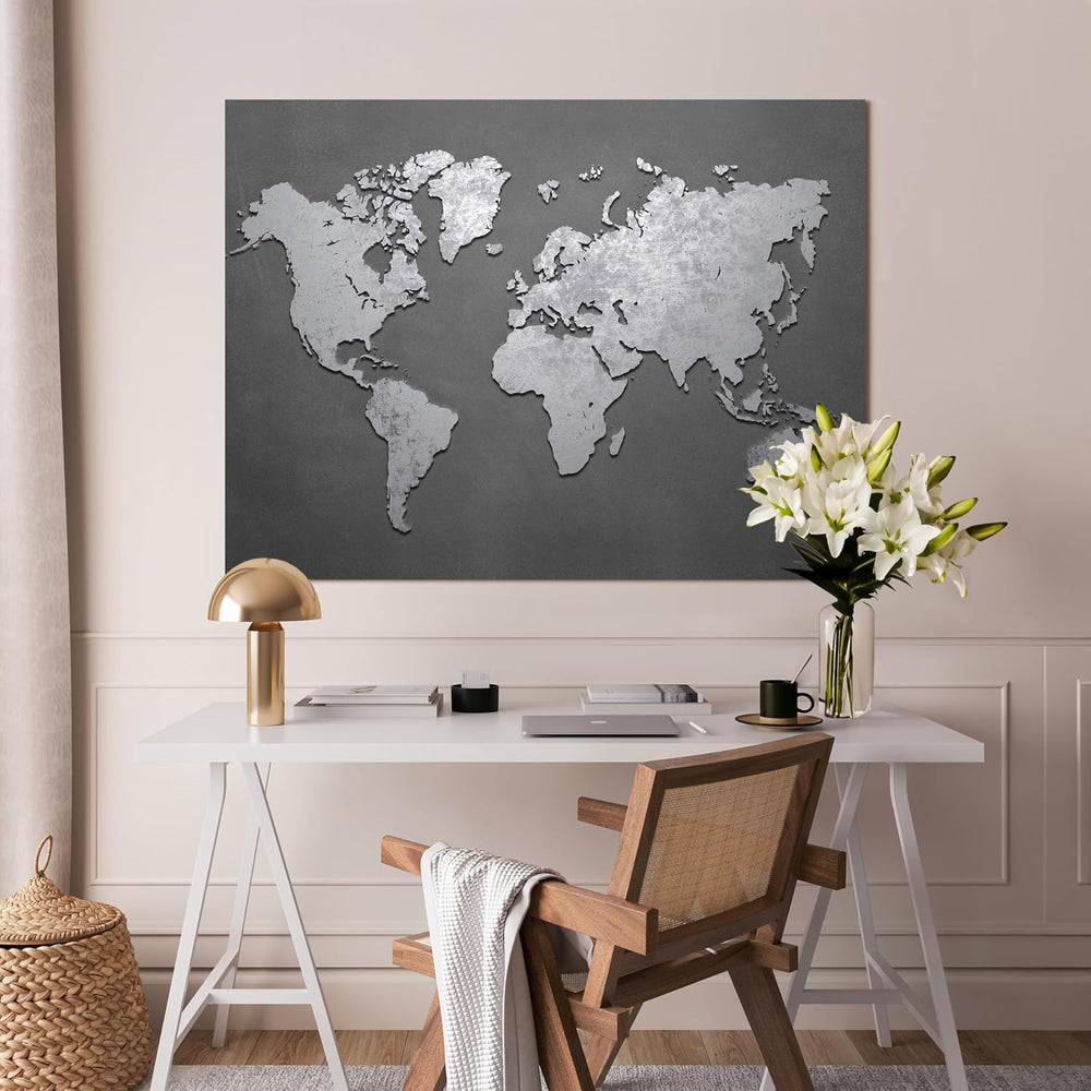 wandmotiv24 Weltkarte auf Leinwand, Grösse 80x60cm Querformat, metallische Landkarte, Metall Effekt,