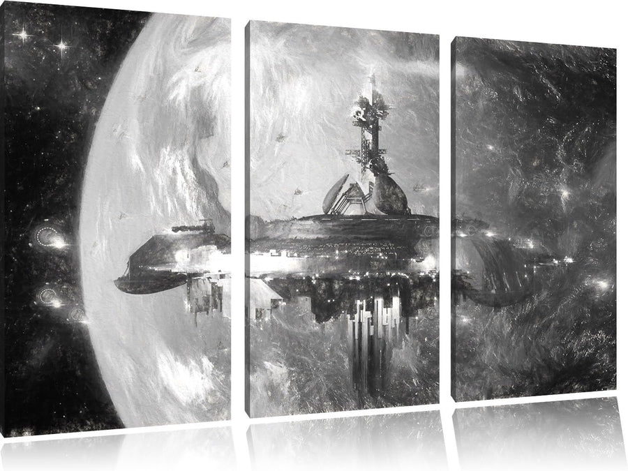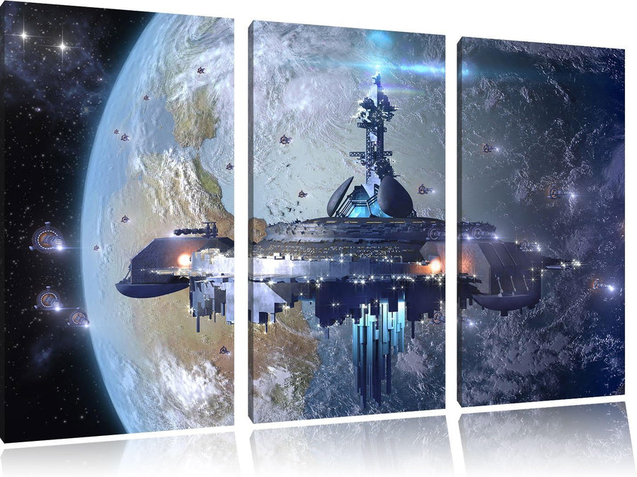 Pixxprint Raumschiff vor der Erde / 3-Teilig/Gesamtmass 120cm Leinwandbild bespannt auf Holzrahmen/W