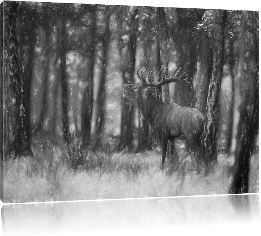 Pixxprint röhrender Hirsch im Wald schwarz/weiss, Format: 70x70 auf Leinwand, 70x70