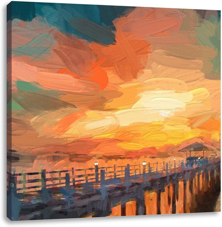 Pixxprint romantischer Steg ins Meer bei Sonnenuntergang Pinsel Effekt, Format: 70x70 auf Leinwand,