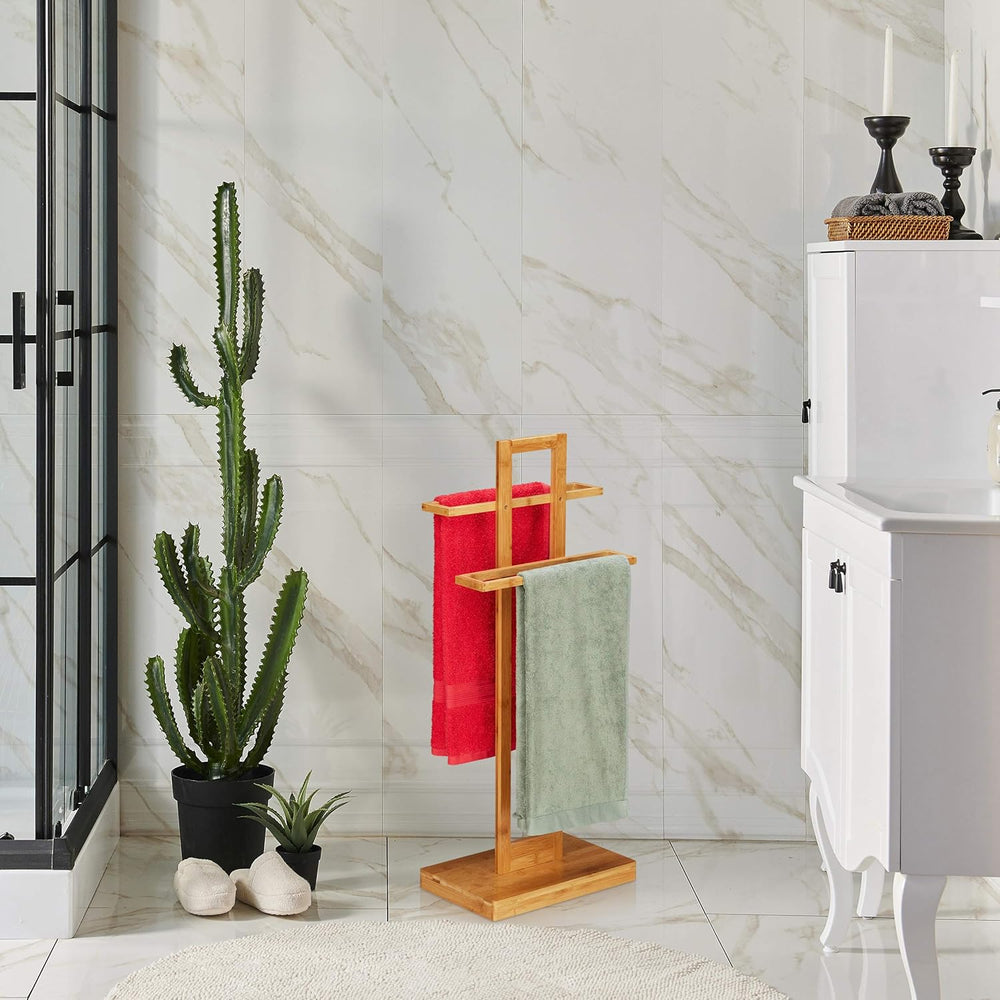 Relaxdays Handtuchhalter stehend, Badetuchhalter Bambus, 2-armig, Bad Handtuchständer, HxBxT: 88 x 3
