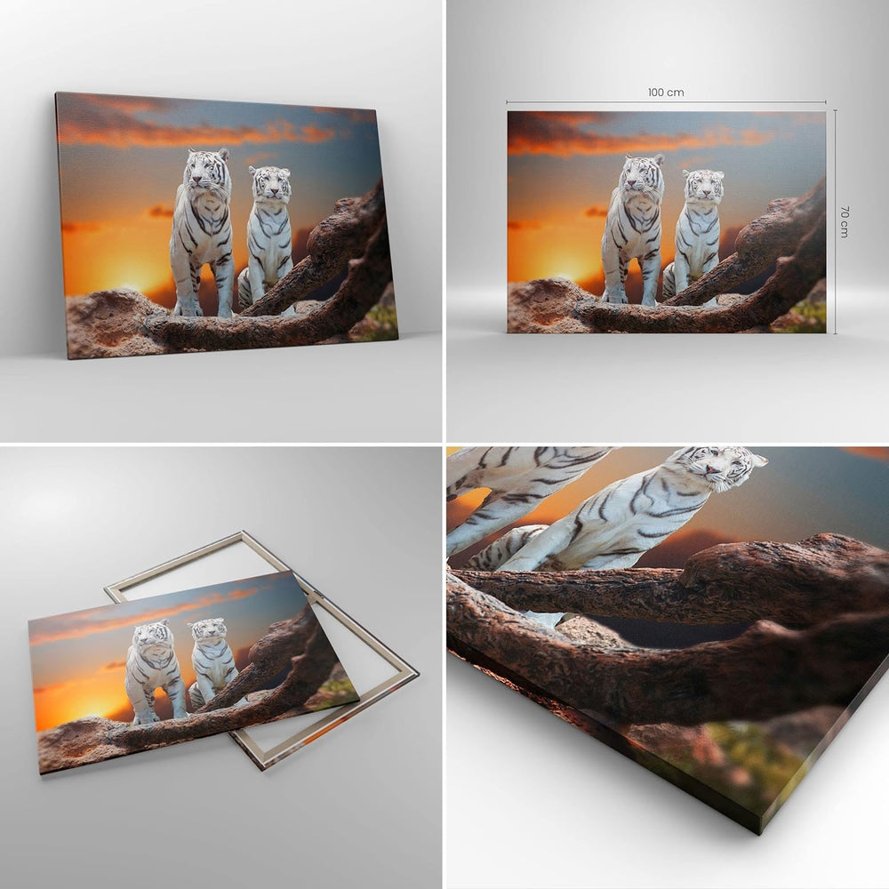 Bilder auf Leinwand 100x70cm Leinwandbild Tiger weiss Rock Sonnenuntergang Gross Wanddeko Bild Schla