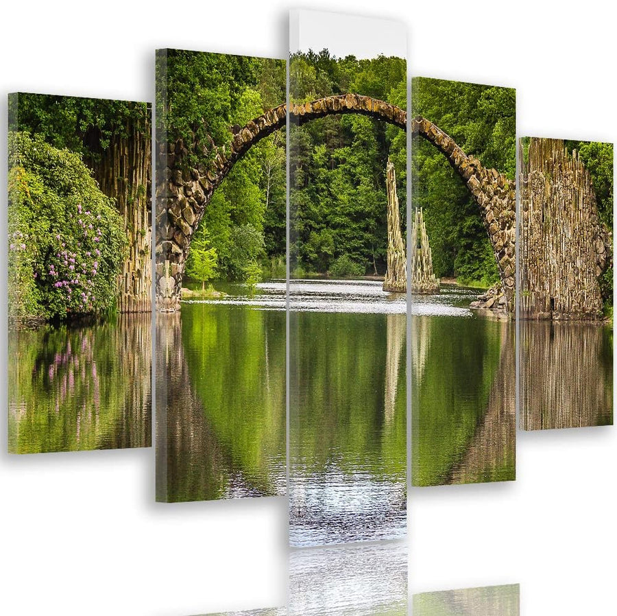 Feeby Leinwandbild 5 Teilig Landschaft Bild Wanddeko Brücke Wasser Wald grün 200x100 cm Leinwandbild