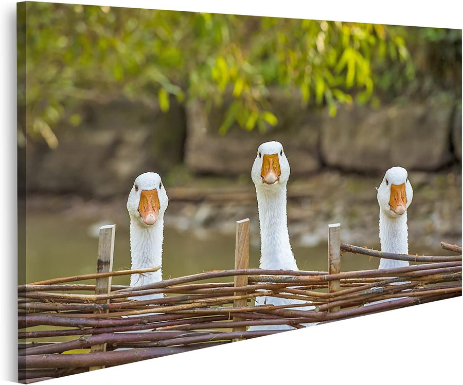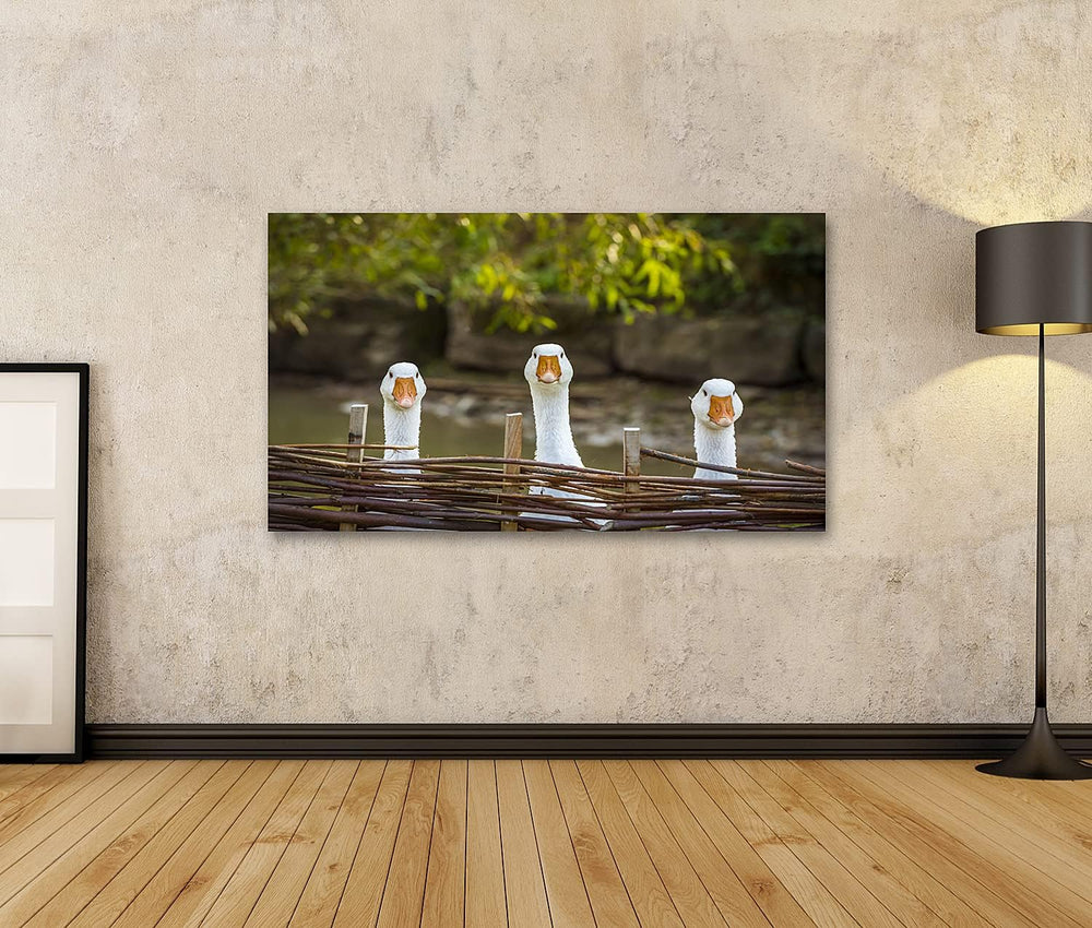 islandburner Bild auf Leinwand Drei Lustige Weisse Gänse Bild Inländischen Hinter Flechtwerk Zaun Bl
