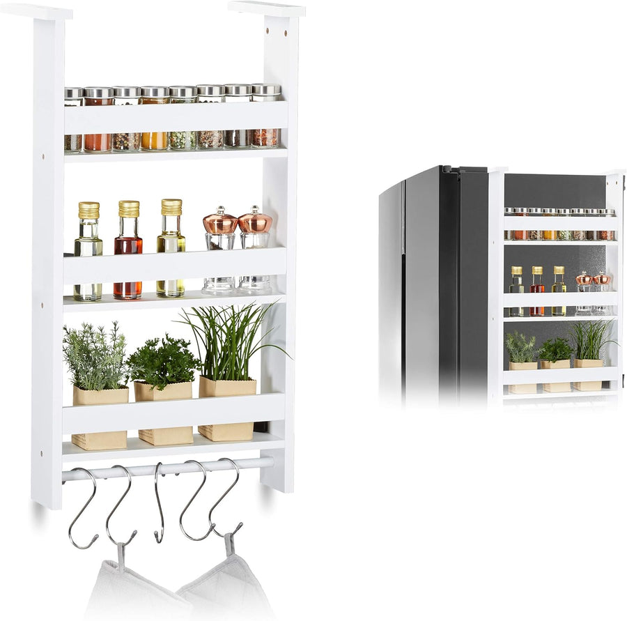 Relaxdays Hängeregal für Kühlschrank, Aufbewahrung von Gewürzen, mit Küchenreling & 5 Haken, MDF, HB