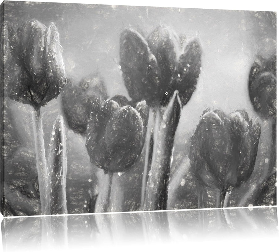 Pixxprint Rote Tulpen mit Tropfen bedeckt / 100x70cm Leinwandbild bespannt auf Holzrahmen/Wandbild K