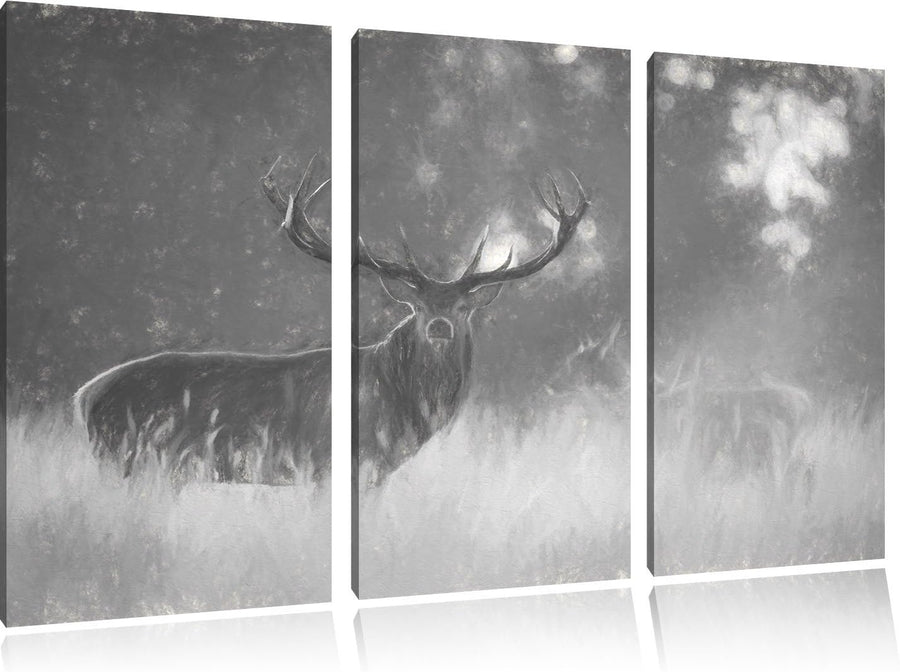 Pixxprint Rotwild im goldenen Morgenlicht Kunst Kohle Effekt 3-Teiler Leinwandbild 120x80 Bild auf L