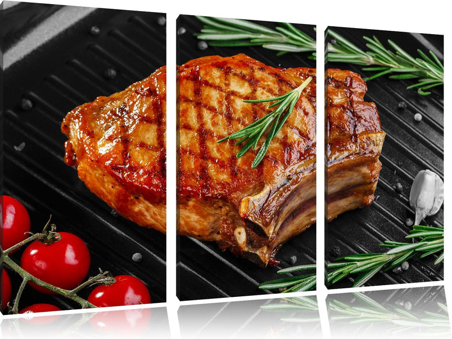 Pixxprint Rumpsteak auf Grill als Leinwandbild/Grösse: 3 Teilig (120x80) cm/Wandbild/Kunstdruck/fert