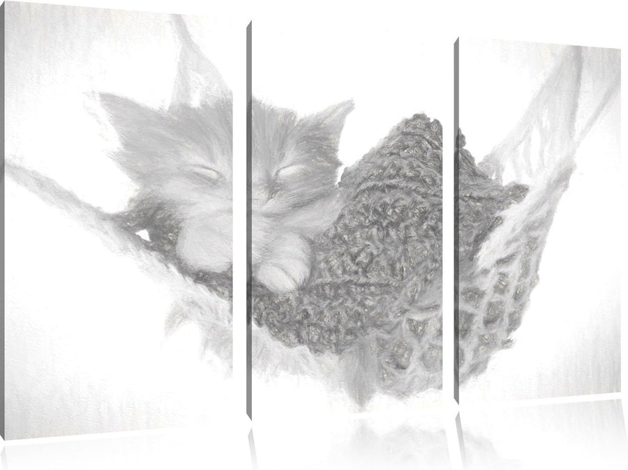 Pixxprint Schlafendes Katzenbaby in Hängematte Kohle Zeichnung Effekt 3-Teiler Leinwandbild 120x80 B