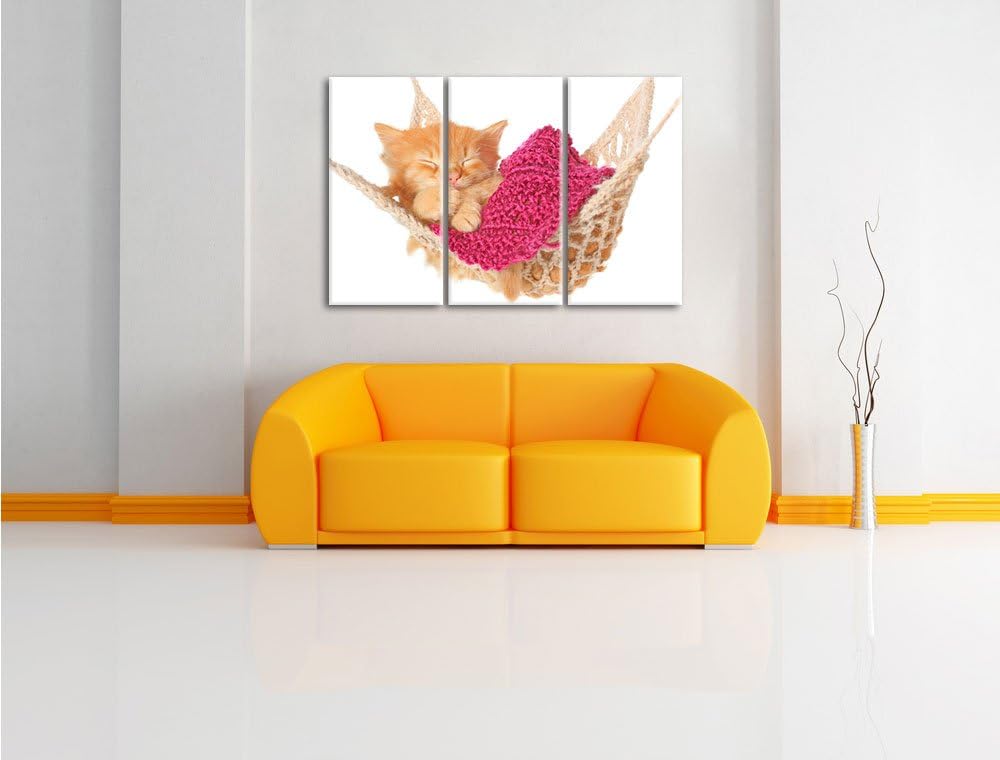 Pixxprint Schlafendes Katzenbaby in Hängematte Pinsel Effekt 3-Teiler Leinwandbild 120x80 Bild auf L