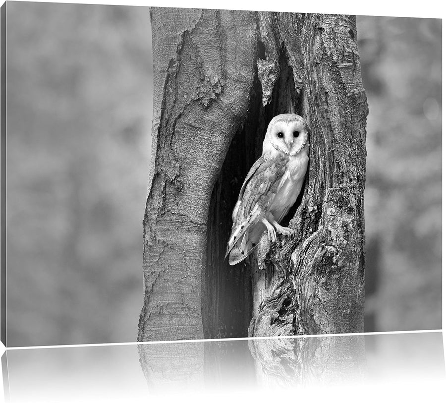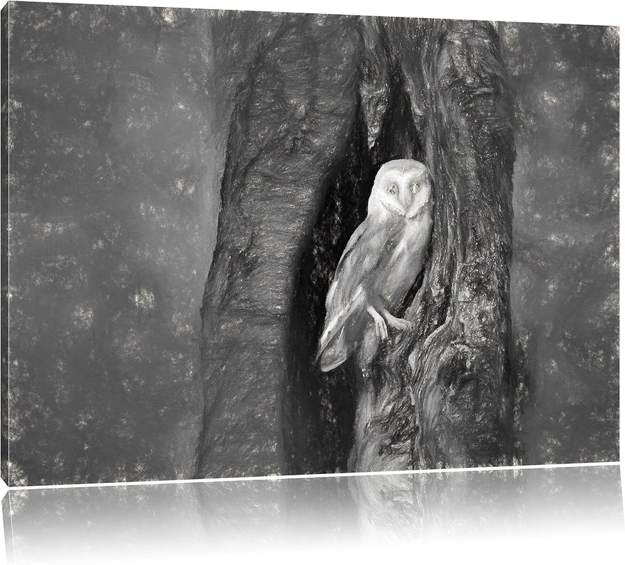 Pixxprint Schleiereule in der Baumhöhle Kunst Kohle Effekt, Format: 100x70 auf Leinwand, XXL riesige