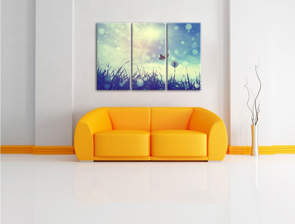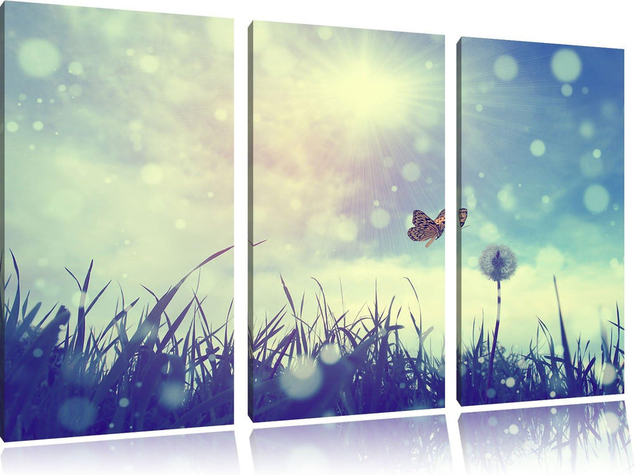 Pixxprint Schmetterling fliegt zu Pusteblume / 3-Teilig/Gesamtmass 120cm Leinwandbild bespannt auf H